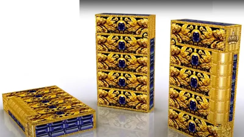 Отмечается, что зажигалка выполнена в виде короны и изготовлена из 400 гр. чистого золота, а также покрыта 152 сапфирами общим весом 41 карат.