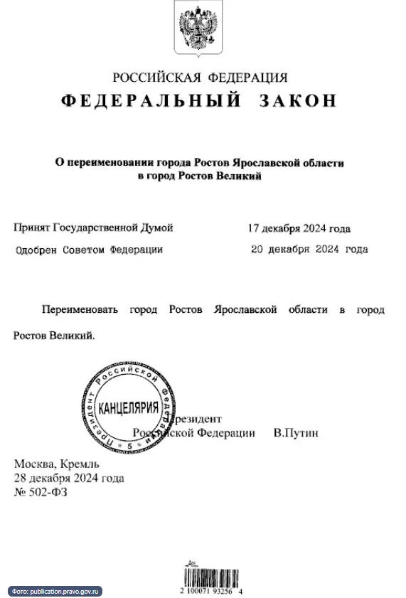 Президент России Владимир Путин подписал закон о переименовании города Ростов Ярославской области в Ростов Великий, сообщает Zakon.kz.